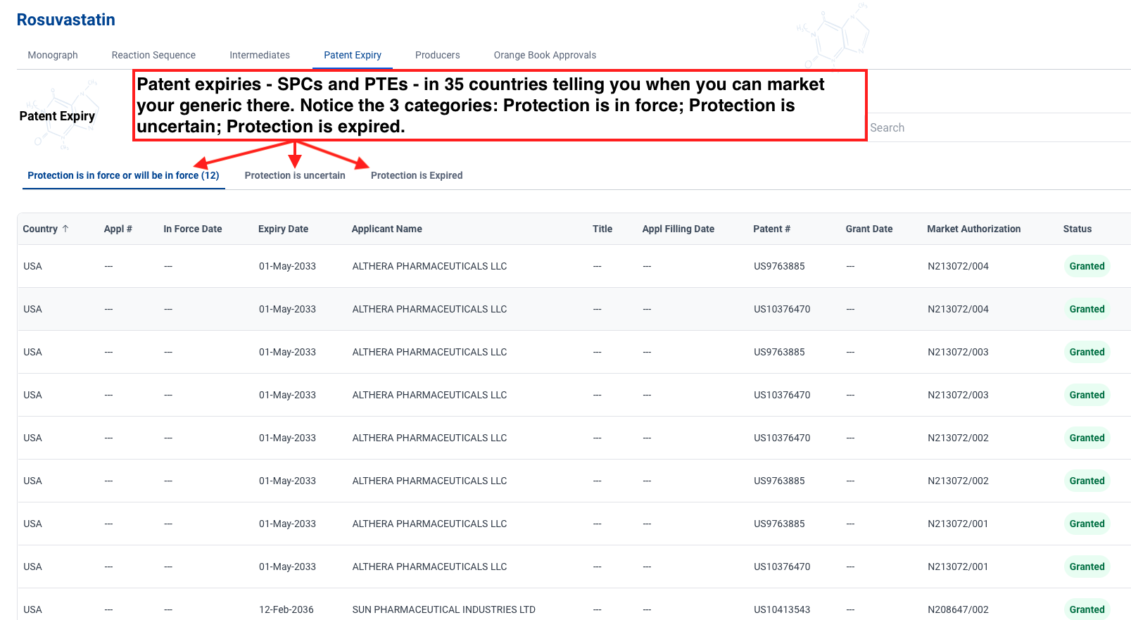 Track patent expiries across 36 countries including Supplementary Protection Certificates (SPCs) and Patent Term Extensions (PTEs).